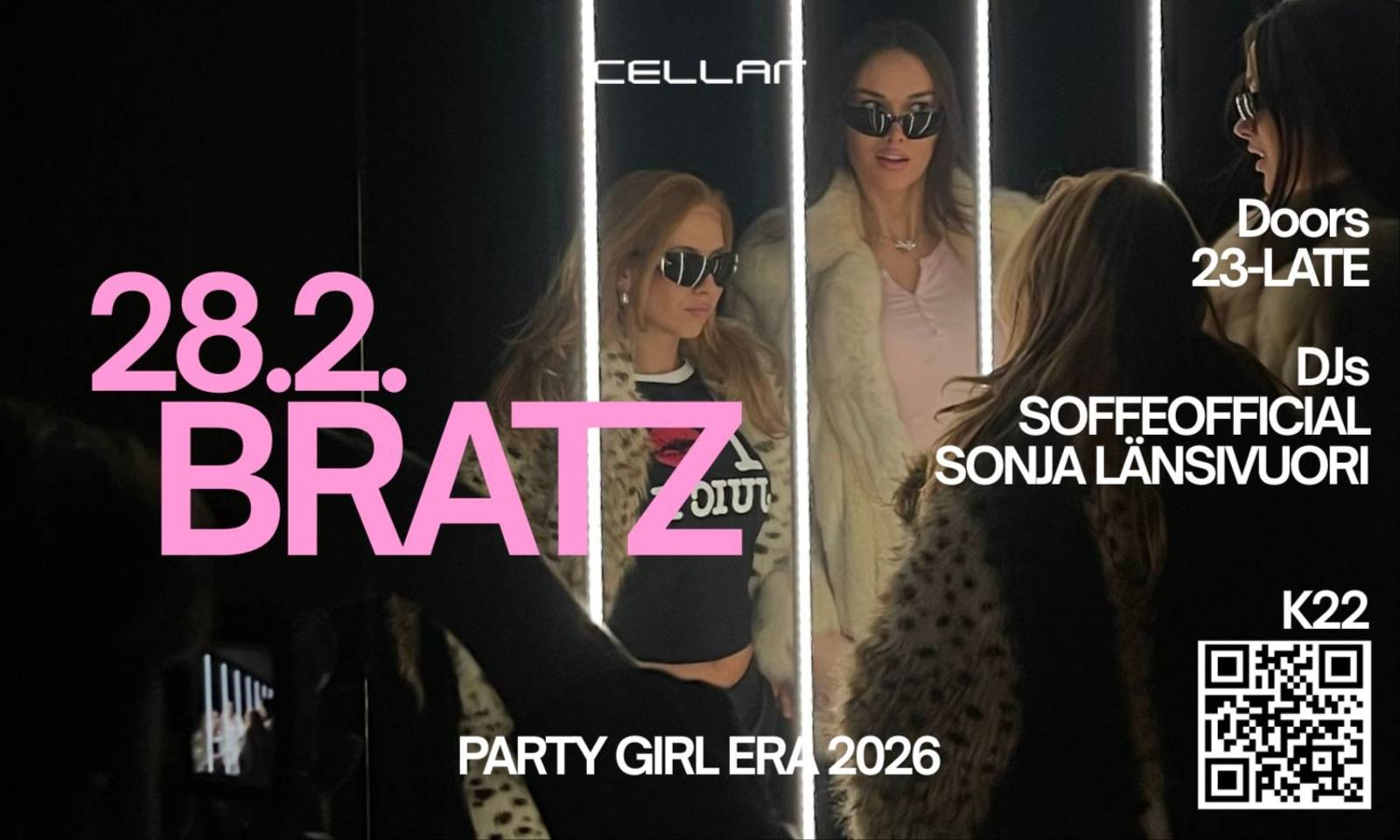 Join us on 28th of Feb - BRATZ’ TAKE OVER CELLAR THINK OF GIRL BOSS POWER, GLITTER, HEELS, CHARLIE XCX, 365 PARTY GIRL, HOUSE MUSIC etc. - that’s BRATZ for you. The cellar will be open from 23:00 until the early hours of the morning, bringing you an unforgettable night of music and celebration. Our DJ duo for the night is SONJA LÄNSIVUORI & SOFFEOFFICIAL – you’ll love them. Purchase your advance tickets early, as we always sell a very limited number of them. Advance tickets grant you VIP-line access. Age limit on Fridays is 20 and on Saturdays 22. Cloakroom fee is 3,90€, payable at the entrance.