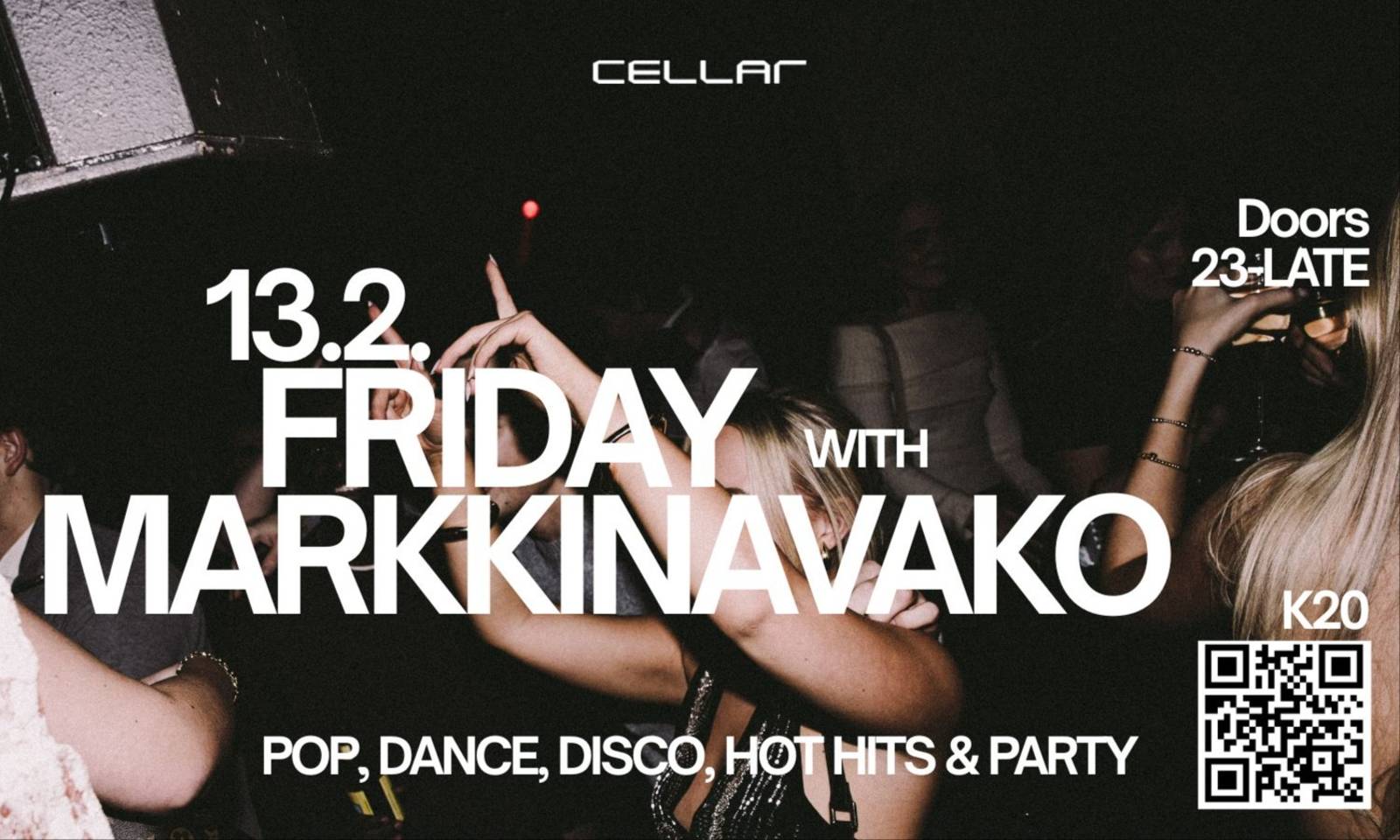 Join us on 13th of Feb - Friday with Markkinavako DJ collective Markkinavako has their Cellar debut! It’s all about pop, dance, disco, hot hits and partying! @markkinavako on Instagram. The cellar will be open from 23:00 until the early hours of the morning, bringing you an unforgettable night of music and celebration. Purchase your advance tickets early, as we always sell a very limited number of them. Advance tickets grant you VIP-line access. Age limit on Fridays is 20 and on Saturdays 22. Cloakroom fee is 3,90€, payable at the entrance.