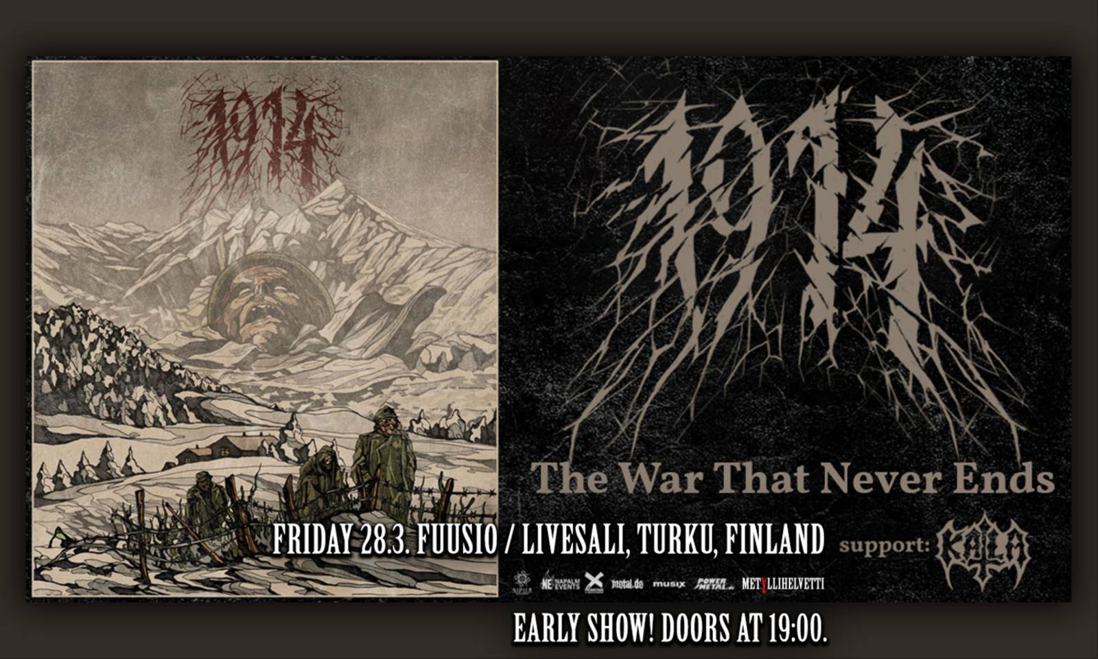 Metallihelvetti & Napalm Events present: The War That Never Ends 1914 (Ukr) Katla (Den) Tickets: pre-sales 27€ / 32€ doors. EARLY SHOW! Doors at 19:00. Age limit 18 years. Fuusion jäsenkortilla ilmainen narikka. **** Ukrainian blackened death/doom formation 1914 return to the battlefield with The War That Never Ends — a new headline tour marking the release of their latest album Viribus Unitis (out November 14, 2025 via Napalm Records). Known for their harrowing WWI narratives, immersive soundscapes, and powerful conceptual storytelling, 1914 now unveil their most dynamic and emotionally resonant chapter to date. Viribus Unitis (“With United Forces”) pushes the band’s signature mix of blackened death metal, crushing doom, and atmospheric tension into broader, more dramatic territory. The album explores not only the horrors of war, but also the endurance, camaraderie, and fragile humanity that emerge from the darkest chaos. With Viribus Unitis, 1914 deliver a deeply cinematic and soul-piercing experience that will come alive on stage with full intensity. Joining them on this campaign are Danish doom lords @KATLADK, whose latest album Scandinavian Pain (out March 21, 2025) has already drawn attention for its bleak atmospheres and emotionally heavy storytelling. Fusing sludge, post-rock, and progressive doom, KATLA explore themes of melancholy, shame, greed, and the weight of human suffering — driven by thunderous drums, distorted walls of guitar, and haunting vocals. Their live performances are known for raw power, tension, and immersive darkness. Two bands shaped by history, grief, and overwhelming heaviness. One tour carrying the banner of stories that refuse to fade. Experience 1914 and KATLA together on The War That Never Ends — a night of blackened fury, doom-laden despair, and emotional weight that lingers long after the final note.