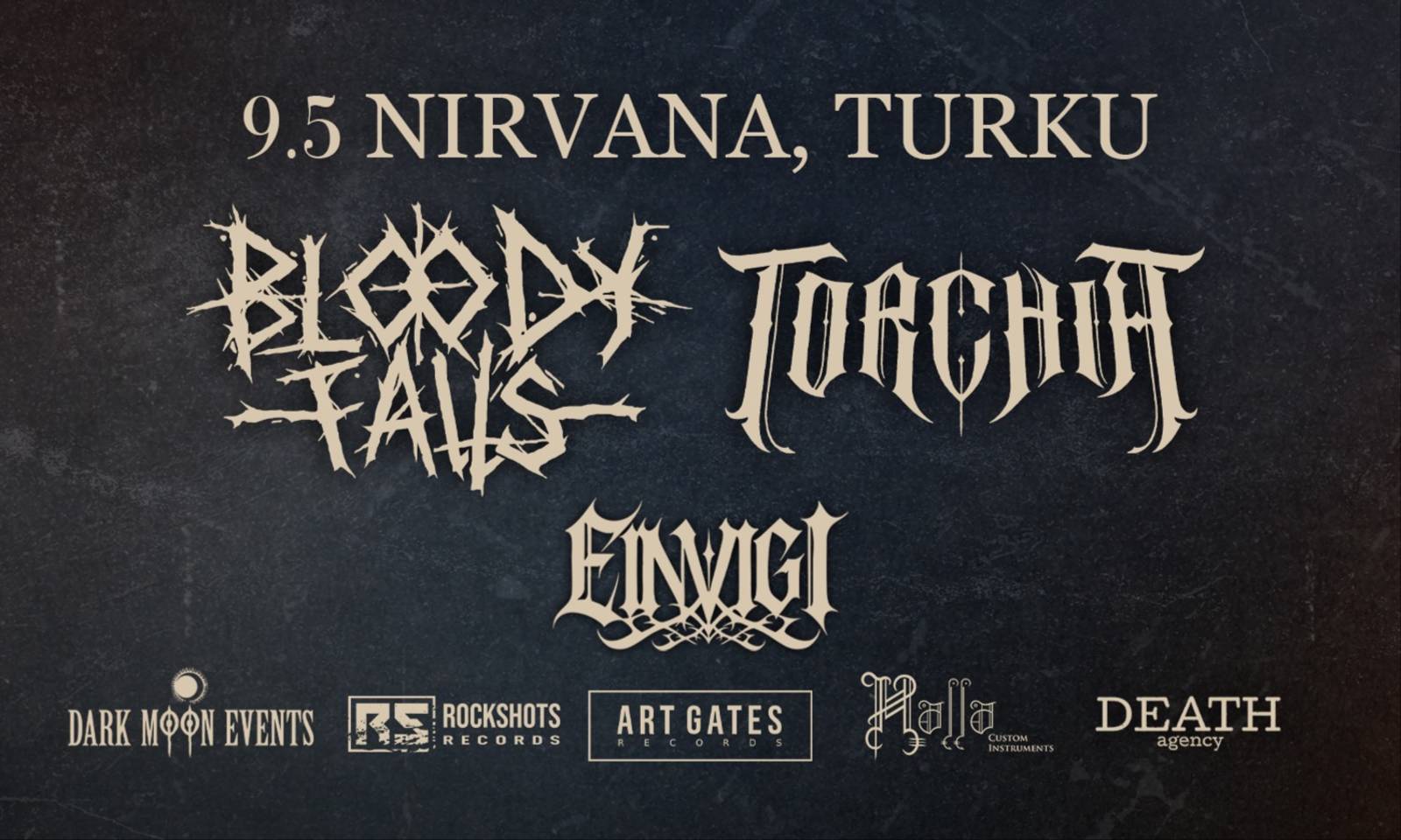Neljäs luku, jae II: co-headliner show Bloody Falls & Torchia/ kahdet levyjulkkarit/ + special guest Einvigi Nirvanassa ollaan lauantaina 9.5. synkissä tunnelmissa, kun lavalle astuu kaksi juuri 4. albuminsa julkaissutta metallibändiä, Bloody Falls ja Torchia. Illassa paikallisena vieraana Einvigi. Kyseessä on kaksinkertaisen levyjulkkariviikonlopun toinen jae, jossa yleisön kuultavaksi vyörytetään groove metalia melodisilla death- ja black-vaikutteilla soittavan Bloody Fallsin ”IV” sekä melodista, teatreaalista death metalia soittavan Torchian ”They Are Born Under Rules of the Darkness”. Liput 10 € ennakkoon, 12 € ovelta 21.00 ovet 21.30 Einvigi 22.30 Torchia 23.30 Bloody Falls Bloody Falls: Bloody Falls perustettiin vuonna 2017 Valkeakoskella. Järkkymättömästä energiastaan ja brutaalista soundistaan tunnettu kokoonpano yhdistelee melodisia death- ja black metal -vaikutteita voimakkaaseen groove metal -ilmaisuun. Terävien riffien, murskaavien rumpujen ja lyyrisen tarinankerronnan myötä Bloody Falls tarjoaa musiikkia, joka on sekä synkkää että tinkimätöntä. "On aina ilo löytää yhtye, jolla on lahjakkuutta, intohimoa ja joka on täysin aito siinä, mitä he tekevät." (Bendetta Baldin/ Chaoszine 7.9.2024) Yhtyeen aiempaan julkaisuhistoriaan kuuluu kolme albumia: ”Amartia” (2024), ”Burn the Witch” (2021) ja ”Thatanos” (2019) sekä EP ”Dying is Easy” (2023). ”Amartia”-albumista on tehty myös instrumentaaliversio, ja tämän myötä yhtye on striimannutkin isosti. Yhtyeen neljäs albumi ”IV” ilmestyy toukokuussa. Bloody Falls on kiertänyt ympäri Suomea rock-klubeilla, esiintynyt festivaaleilla ja vieraillut ulkomailla, kuten Virossa ja Portugalissa. Linkit: Spotify: https://open.spotify.com/artist/70aIXAYbZd48wRhXJfa39r YouTube: https://www.youtube.com/channel/UCKMBa9_Kbc7M10heg0iT-Fg Torchia: Tamperelainen Torchia on hionut synkkää ja aggressiivista melodisen death metalin tulkintaansa 2010-luvun alkupuolelta saakka. Ahkeran koti- ja ulkomailla keikkailun myötä yhtye on ansainnut maineen räjähtävistä live-esiintymisistään, joita johtaa salaperäinen keulahahmo Nox. Torchia tarjoaa yleisölleen toismaailmallisen live-elämyksen tinkimättä metallisesta intensiteetistä. Melodisessa death metalissa Torchia painottaa vahvasti sanaa “death”– niin musiikillisesti kuin temaattisestikin. Yhtyeen neljäs albumi ”They Are Born Under Rules of the Darkness”, joka julkaistaan toukokuussa 2026, on tämän sanoman manifesti. Goottilaiset kauhukertomukset sijoittuvat synkkään 1800-luvun miljööseen, ja tarttuvat melodiat sekä terävät kitarariffit on tehty ennen kaikkea live-yleisöä varten. Spotify: https://open.spotify.com/artist/50kAqTuSOb54sRSuwgzHx0 YouTube: https://www.youtube.com/@TorchiaOfficial Einvigi: Turkulainen Einvigi verhoaa kuuntelijansa herkän mutta raa'an tunnelman vietäväksi. Yhtyeen musiikkia on kuvailtu termillä post-black metal ja siltä on tullut kolme albumia: ”Sielulintu” (2020, Inverse Records), ”Yö Kulje Kanssani” ja ”Monokroma” (2022 & 2024, Einheit Produktionen). Yhtyeen sointi on kehittynyt vuosi vuodelta synkemmäksi ja parhaillaan se työstää neljättä albumiaan, joka tulee olemaan sen raskain teos. Soptify: https://open.spotify.com/artist/12lspUHMcheVcVtE5et9TF YouTube: https://www.youtube.com/@einvigibandofficial