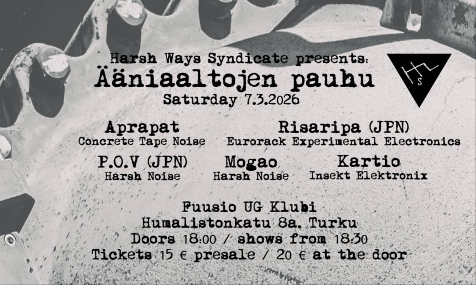 Harsh Ways Syndicate presents: Ääniaaltojen pauhu Saturday 7.3.2026 Fuusio / UG Klubi Humalistonkatu 8a Doors open at 18:00, shows from 18:30 onwards. Tickets: 15 € presale 20 € at the door Aprapat - Concrete Tape Noise https://aprapat.bandcamp.com/album/reef-crasher Risaripa (JPN) - Eurorack Experimental Electronics https://www.instagram.com/risaripa_?igsh=MmwwYjZpMWw0ZzYy P.O.V. (JPN) - Harsh Noise https://www.instagram.com/pov.noise?igsh=MTE2and3YzV2dXo5MA== Kartio - Insekt Elektronix https://umpio.bandcamp.com/album/liskoaivo Mogao - Harsh Noise https://satatuhatta.bandcamp.com/album/tri-k-ya