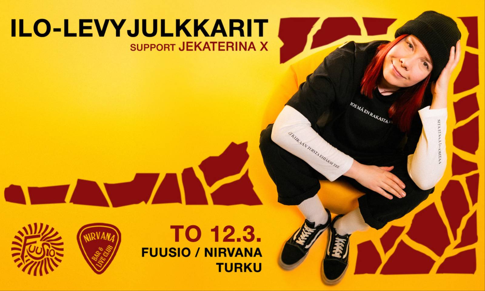 12. maaliskuuta Nirvanassa juhlitaan ILO:n debyytti-EP:tä! Julkaisukeikalla menossa mukana myös Jekaterina X! SOITTOAIKATAULU 19:00 Ovet auki 19:30 Jekaterina X 20:45 ILO Liput ennakkoon 8€, ovelta 12€. Narikka 3,50€, Fuusion jäsenkortilla narikka on ilmainen Liity jäseneksi täältä: https://fuusioturku.fi/osallistu/ ILO ILO on normeja rikkova, persoonallinen artistilauluntekijä, joka surffaa suomenkielisen poprockin uudella aallolla. Hänen musiikissaan popin koukuttavat melodiat ja herkkä tarinankerronta kohtaavat säröisten kitaroiden ja rosoisen laulun voiman. ILO on suomirockin oma Care Bear – lempeä ja helposti lähestyttävä, pehmeä kapinallinen, joka ei pelkää olla avoimesti haavoittuvainen ja taistella niiden asioiden puolesta, joihin uskoo. ILO Instagramissa: https://www.instagram.com/ilomusiikki/ ILO Spotifyssa: https://open.spotify.com/artist/29PSvcmaFVFfpfv12p1nud?si=l2FECh… JEKATERINA X Jekaterina X on suomalainen nouseva pop-artisti, joka yhdistää elektronisen popin, tarttuvat kertosäkeet ja vahvan asenteen. Keväällä julkaistava debyytti-EP Sekasin mut elossa syventää artistin tunnistettavaa dark pop -soundia ja nostaa energian uudelle tasolle. Livenä Jekaterina X on karismaattinen, intensiivinen ja vauhdikas – keikka, joka tempaisee yleisön mukaan ja pitää otteessaan alusta loppuun asti. Nirvanassa luvassa on tunnelmallinen ja energinen live-keikka, jossa kuullaan myös vielä julkaisemattomia kappaleita! Jekaterina X Instagramissa: https://www.instagram.com/xjekaterinax/ Jekaterina X Spotifyssa: https://open.spotify.com/artist/64MEFH8P0bmVtOpQuPue0p?si=NT2IPX…