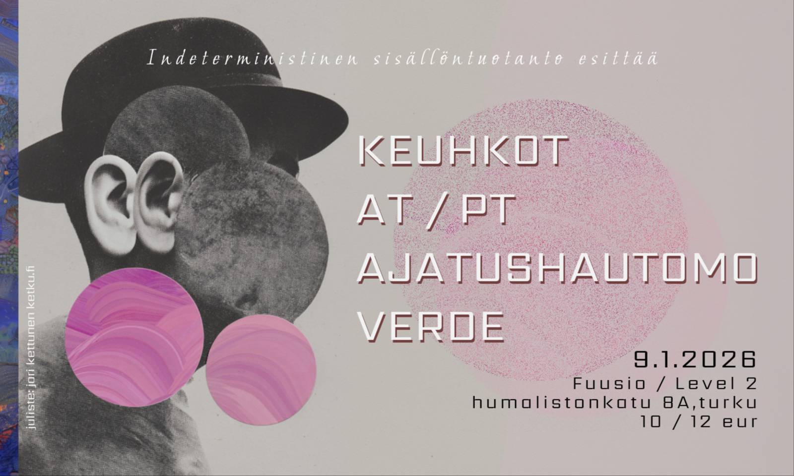 Indeterministinen sisällöntuotanto esittää... KEUHKOT VERDE AT/PT AJATUSHAUTOMO Erikoismusiikkia. Kuvaa ja ääntä. Fuusio / Level 2 Humalistonkatu 8a Liput 10€ (+0,50€ palvelumaksu) ennakkoon 12€ ovelta. Fuusion jäsenkortilla ilmainen narikka. KEUHKOT Suomalaisen progepunkin pioneeri. Avantgarderockin legenda. Persoonoista riippumaton ilmaisumuoto, jonka epätäydelliset, ihmishahmoiset toteuttajat ovat tällä hetkellä lähinnä Kake Puhuu ja Marko Ojala. https://www.rumba.fi/uutiset/vuonna-1988-suomessa-perustettiin-y… VERDE Mika Verde Rintala on suomalaisen syntetisaattorimusiikin- ja rakentamisen uranuurtajia, jonka jokainen soitin on jo itsessään taideteos. Verden lisäksi Rintala tunnetaan myös yhtyeistä Ektroverde, Eturivi ja Kirvasto, sekä yhteistyöstä mm. Circlen ja Otto Donnerin kanssa. Verde on julkaissut yli 30 levyä ja tehnyt satoja videoita joita konserteissa usein nähdään. https://verdeaudio.com/ AT/PT is formed by Finnish noise/experimental/electronic scene legends Antti Tolvi and Pink Twins. An ecstatic, maximalist, over-the-top, full frequency range celebration of in-your-face noise, explicit electronic sonics and transcendental harmonics. https://pinktwins.bandcamp.com/album/hyperheliopolis AJATUSHAUTOMO Vapaata tajunnanvirtaa. Sisäiseen harmoniaan pyrkivää keskittymishäiriöistä silppua. Vaikea tietää etukäteen mitä on tulossa (paitsi jos kysyy). https://ajatushautomo.bandcamp.com/