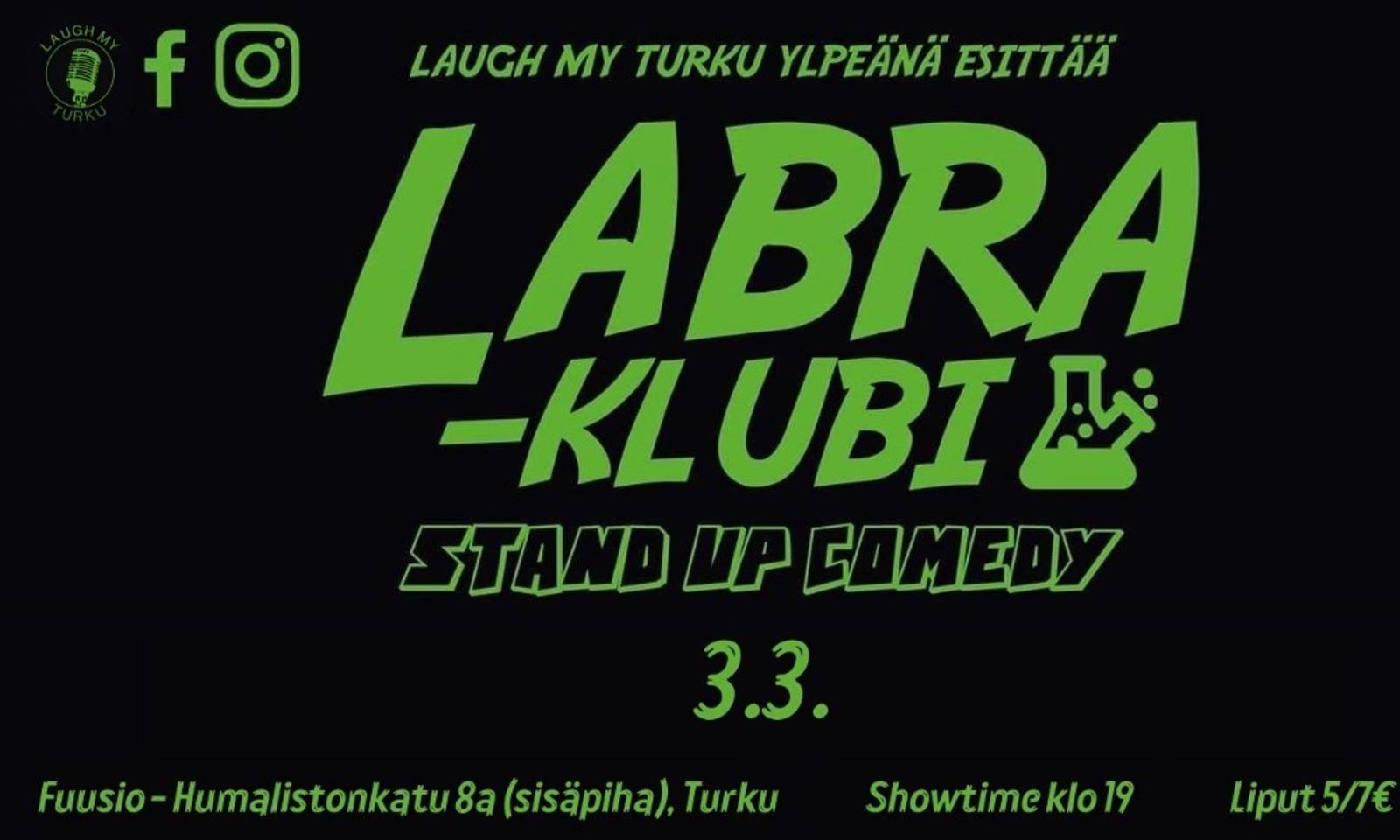 Laugh my Turku esittää: Labra-Klubi vol. 4! Ti 3.3. Fuusio / Level 2 (Humalistonkatu 8a) Showtime klo 19. Liput 5€ ennakko / Ovelta 7€ (erityisryhmät 5€). Narikka 3,50€. Fuusion jäsenkortilla ilmainen narikka. Liity jäseneksi täällä: https://fuusioturku.fi/osallistu/ Kulttuuritalo Fuusion stand up -klubilla komedian rajat venyvät ja uudet ideat syntyvät! Tässä huumorin laboratoriossa uusi juttu voi levitä käsiin, tai räjäyttää yleisön nauramaan! Labra-klubilla pääset seuraamaan sekä perinteistä stand uppia, että mahdollisesti jotain erikoisempaa lavakomiikkaa. Lavalle saatetaan tuoda hahmokomiikkaa, nukkeja, tai (herra mun vereni) kitara! Labra-klubilla tuntemattomat koomikot saavat tilaisuuden nousta esiin, ja kuka tietää, ehkä juuri täällä kuullaan seuraava hittivitsi, joka päätyy myöhemmin televisioon. Jos pidät siitä, että huumorisi valmistetaan tuoreena ja ripauksella riskiä, Labra-klubi on sinun paikkasi! Tämän testilaboratorion tulokset ovat usein yllättäviä, ja aina naurettavia! Tervetuloa Turun omaperäisimmälle stand up -klubille!