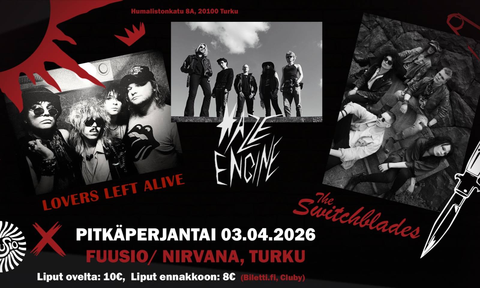 Keikka on valitettavasti peruuntunut. Rahat palautetaan automaattisesti ennakkolipun ostaneille. Kevään kuumin katurock-ilta Fuusiossa pitkänäperjantaina 3. huhtikuuta! Aikataulu: 21.00 ovet 21.30 The Switchblades 22.30 Haze Engine 23.30 Lovers Left Alive Lovers Left Alive 20-luvun alussa perustettu Lovers Left Alive on päätynyt viime vuosien aikana lähes jokaisen underground rock-diggarin huulille, suosion kasvaessa puskaradioiden kautta yli sukupolvirajojen. Menevä eikä meinaava bändi tunnetaan sarjakuvahahmomaisten soittajien ja raa'an energian lisäksi konstailemattomasta asenteestaan ja arvaamattomasta meiningistä, joka hengittää ja huokuu rock and rollin syvintä olemusta. Viime syksynä ilmestynyt How..-debyyttialbumi on kerännyt ylistäviä arvioita ulkomaita myöten, ja ovet kansainväliseen kulttisuosioon alkavat olla auki. Haze Engine Haze Engine on turkulainen punkhengellä varustettu rockbändi. Höyryjunan voimalla eteenpäin kulkeva bändi valmistelee tällä hetkellä seuraavia julkaisuja bändin nimibiisin seuraajaksi. Haze Enginen jäsenet ovat entuudestaan tuttuja mm. Underclassista, Jytäorkesterista sekä Daze Dollsista. The Switchblades The Switchblades räjäyttää! — anteeksipyytelemätön, kesyttämätön ja iskee minne haluaa, milloin haluaa. Bändin soundi on raaka ja räjähtävä cocktail: riisuttu rock’n’roll-asenne, rockabillyn boogie sekä punkrockin isku ja törkeys. Tämä on yksinkertaista musiikkia yksinkertaisille ihmisille — eikä yleisö varmasti jää kylmäksi. Liput ennakkoon 8€, ovelta 10€. Narikka 3,50€, Fuusion jäsenille ilmainen narikka.