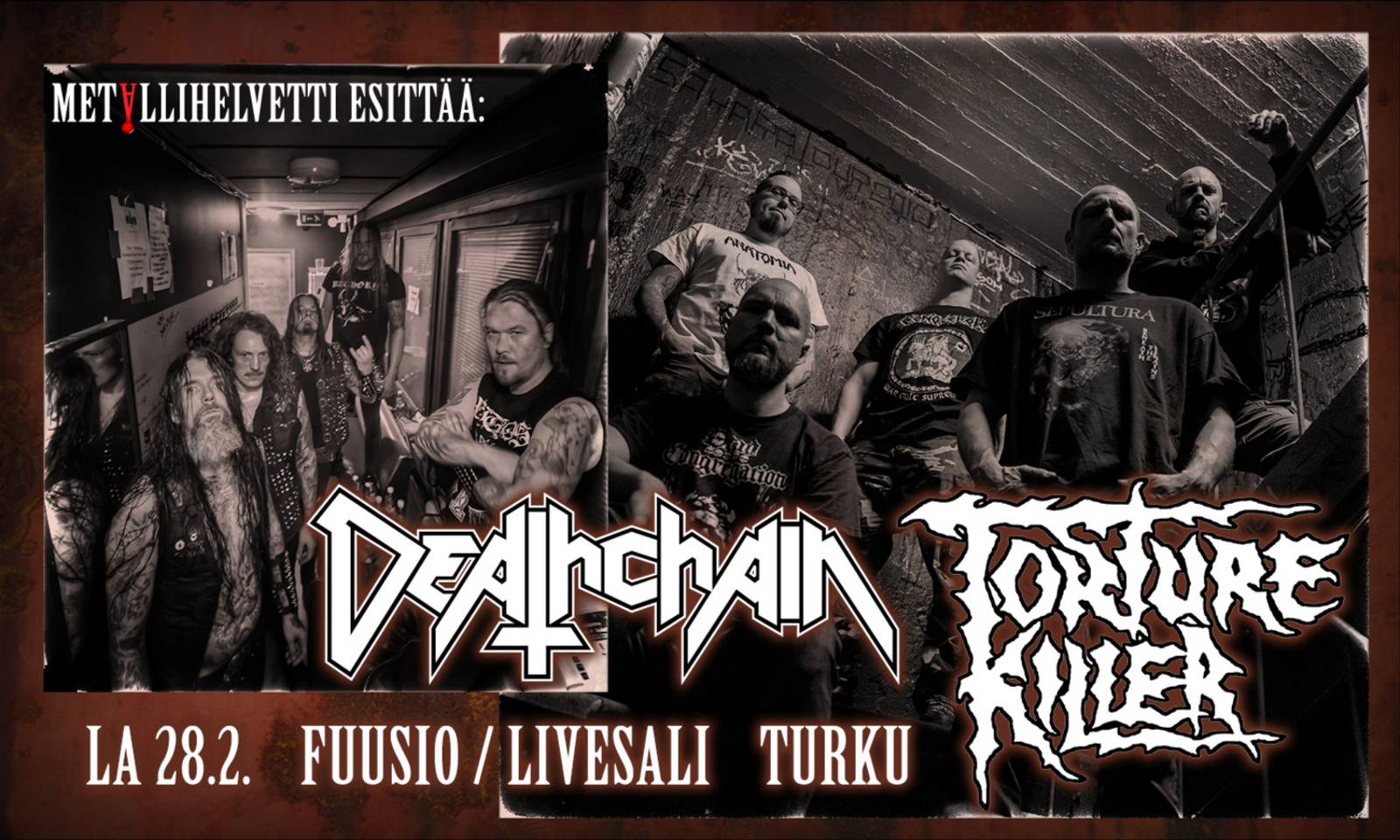 Metallihelvetti esittää TORTURE KILLER DEATHCHAIN Liput 20€ ennakko / 25€ ovelta. Narikka 3,50€ Fuusion jäsenkortilla ilmainen narikka. Hanki jäsenyys täältä: https://www.fuusioturku.fi/osallistu Vapaaliput eivät käy tälle keikalle. K18. HUOM! Aikaiset soittoajat!