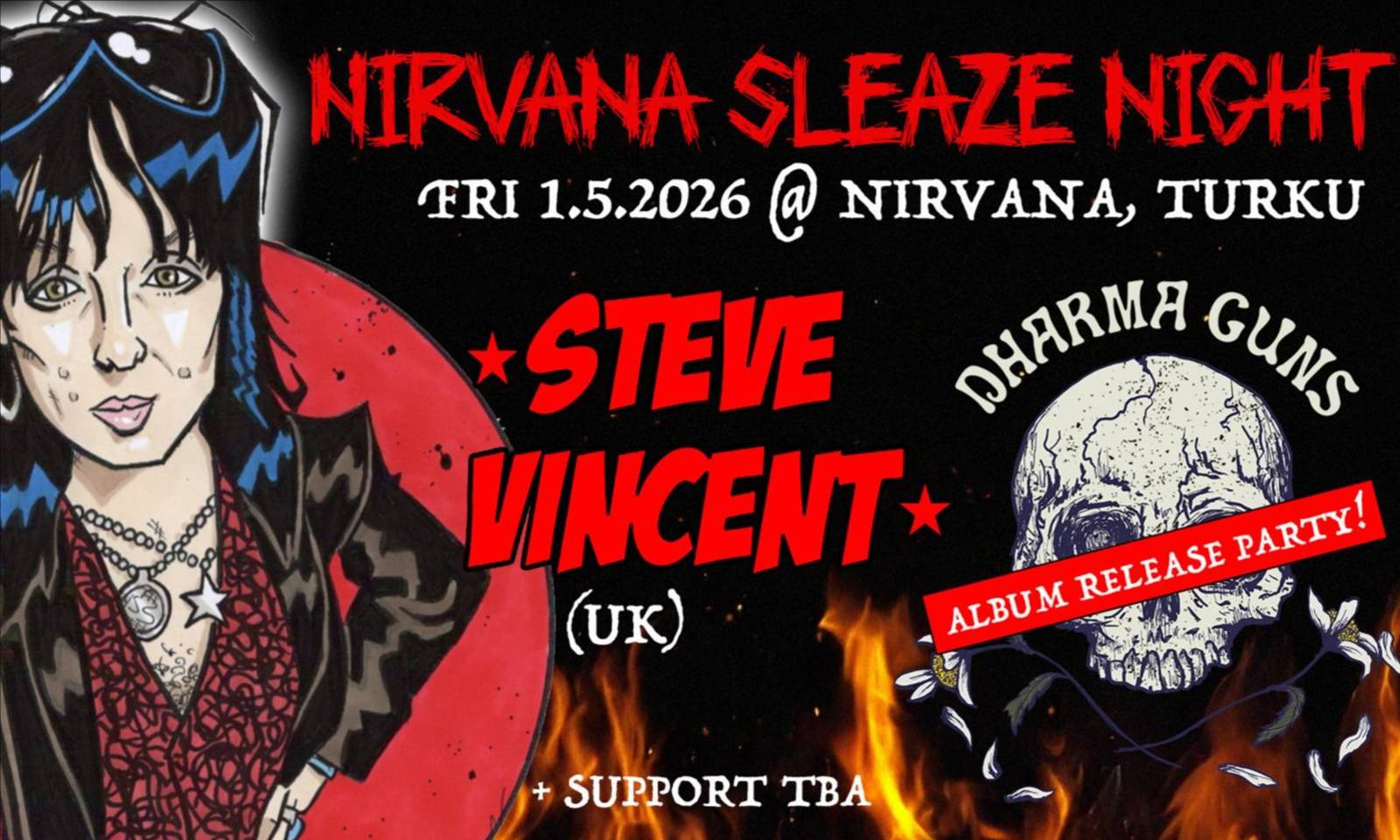 PE 1.5.2026 // NIRVANA BAR Nirvana Sleaze Night – Steve Vincent (UK), Dharma Guns & tba Liput ovelta 12e (mikäli vielä jäljellä) Ennakkoliput 10e. Nirvana Sleaze Night tuo Helsingissä kertaalleen menestyksekkäästi järjestetyn klubikonseptin Turkuun. Katu-, glam- ja sleazerockin nousun myötä alan bändit päättivät ensimmäisen kerran järjestää kokoontumisajot keväällä 2025. Vappuna 2026 pistetään paremmaksi, kun iltamat ulotetaan peräkkäisinä iltoina Helsingin lisäksi Turkuun. Lauteilla toisen levynsä julkaisua juhlistava kotimainen Dharma Guns ja brittiläinen glampunklegenda Steve Vincent (Paradise Alley). Illan lämmittelijä ilmoitetaan myöhemmin. Dharma Guns (levynjulkkarikeikka) Dharma Guns soittaa rock ’n’ rollia, jossa kuuluvat protopunkin ja Scandinavian action rockin vaikutteet. Yhtyeen marraskuussa 2024 julkaistu debyyttialbumi Ex-Generation Superstars (Rockhopper Music) herätti kuhinaa skenessä ja sai huomiota muun muassa Soundilta, Kaaoszinelta ja brittiläiseltä Vive Le Rockilta, joka arvioi albumin pistein 8/10. Kanadalainen V13 puolestaan kirjoitti, että ”Ex-Generation Superstars esittelee liudan singalong-kertosäkeitä, kuumia kitarariffejä ja perinnetietoista groovea, joka muistuttaa kuulijaa siitä, miksi rock on lähtökohtaisesti niin mahtavaa.” Nyt Dharma Gunsin tarina on edennyt seuraavaan lukuun. Toisen albumin julkaisukiertueella nähdään, kuinka pitkälle syksyisestä ”King of Action Rock” -singlestä alkanut matka tulee bändin viemään. Keikkoja on sovittu Ruotsia ja Iso-Britanniaa myöten. Steve Vincent (UK) Kun Steve Vincent kokosi Lontoon undergroundskenessä glampunk-bändinsä Paradise Alleyn vuonna 1992, hän ei voinut kuvitellakaan, mihin se hänet veisi. Kahden albumin, EP:n ja lukemattomien kiertueiden jälkeen – mukaan lukien kaksi Yhdysvalloissa – sekä esiinnyttyään headlinerina Lontoon The Marqueessa, New Yorkin CBGB:ssä ja Los Angelesin The Whiskeyssä, Steve otti ensimmäiset varovaiset askeleensa soolouralle vuonna 2022. Pari vuotta myöhemmin julkaistu toinen albumi The Best Kept Secret In Rock’n’Roll vakiinnutti hänen asemansa lauluntekijänä ja karismaattisena keulahahmona. Jos 70-luvun Rolling Stones, Ramones, Dogs D’Amour ja Stiv Bators kolahtaa, Steve Vincent kolahtaa myös! Kuriositeettina mainittakoon, että Stevellä on ollut sormensa pelissä myös Helsingin gootti- ja glamlegendojen The 69 Eyesin ja Plastic Tearsin ensimmäisillä Ison-Britannian-kiertueilla.