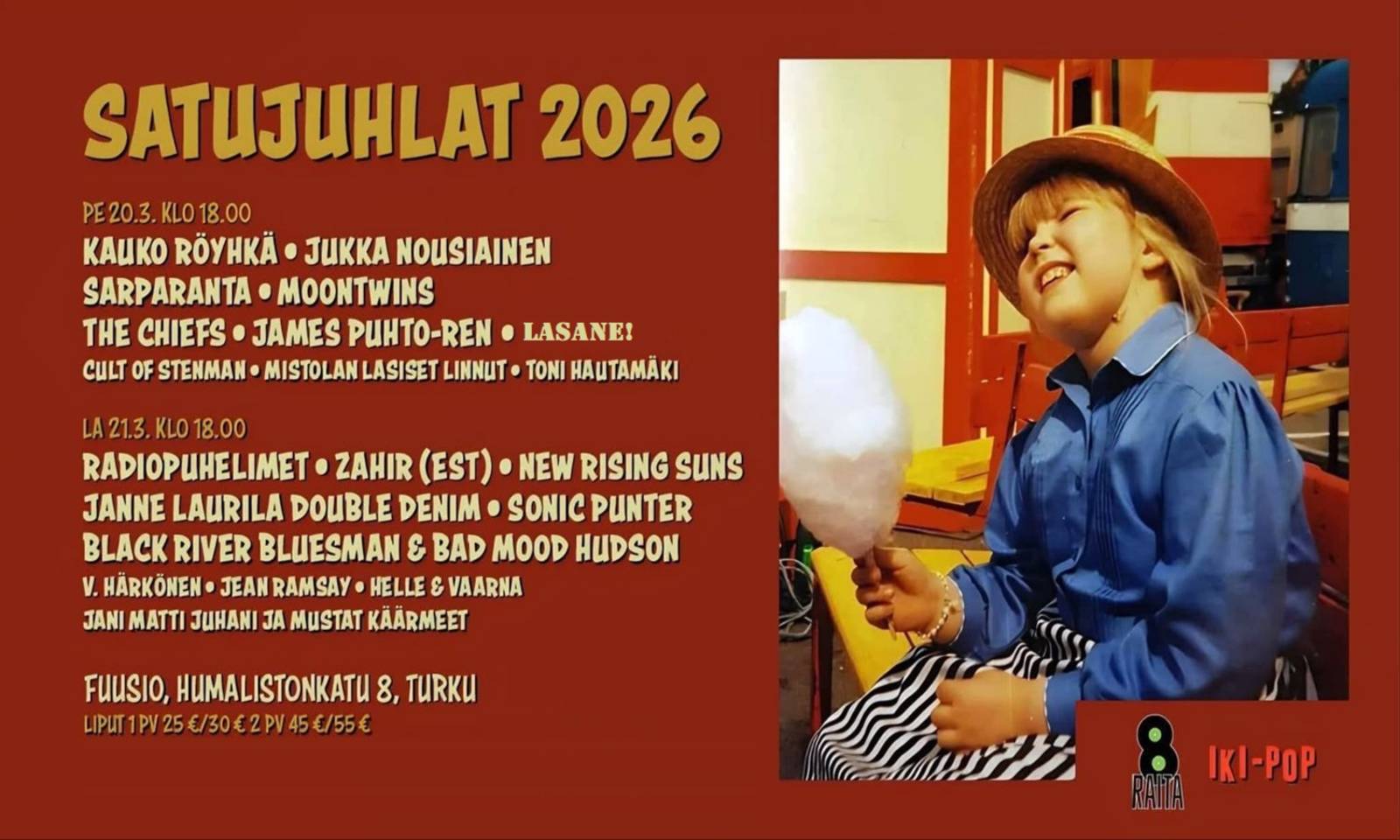 Satujuhlat tulee taas! Fuusion Livesalissa ja Level 2:ssa rytisee koko viikonlopun ajan, kun Satujuhlien vuoden 2026 painos tarjoilee tuutin täydeltä upean musiikin ilosanomaa kahden festari-illan aikana! ESIINTYJÄT - Lauantai 21.3.2026: RADIOPUHELIMET ZAHIR (EST) NEW RISING SUNS JANNE LAURILA DOUBLE DENIM SONIC PUNTER BLACK RIVER BLUESMAN & BAD MOOD HUDSON V. HÄRKÖNEN JEAN RAMSAY HELLE & VAARNA JANI MATTI JUHANI & MUSTAT KÄÄRMEET Soitto alkaa klo 18:00. HUOM!! Soittoaikataulu tarkentuu lähempänä. LIPUT: Lauantain päivälippu: 25€ ennakkoon(+palvelumaksu), 30€ ovelta Perjantain ennakkoliput myynnissä täällä: https://cluby.com/fuusio/events/satujuhlat-2026-perjantain-lippu… Kahden päivän ennakkoliput myynnissä täällä: https://cluby.com/fuusio/events/satujuhlat-2026-2pv-lippu/VENUE_… Narikka 3.50€, Fuusion jäsenkortilla ilmainen narikka. Liity jäseneksi täällä: https://fuusioturku.fi/osallistu/