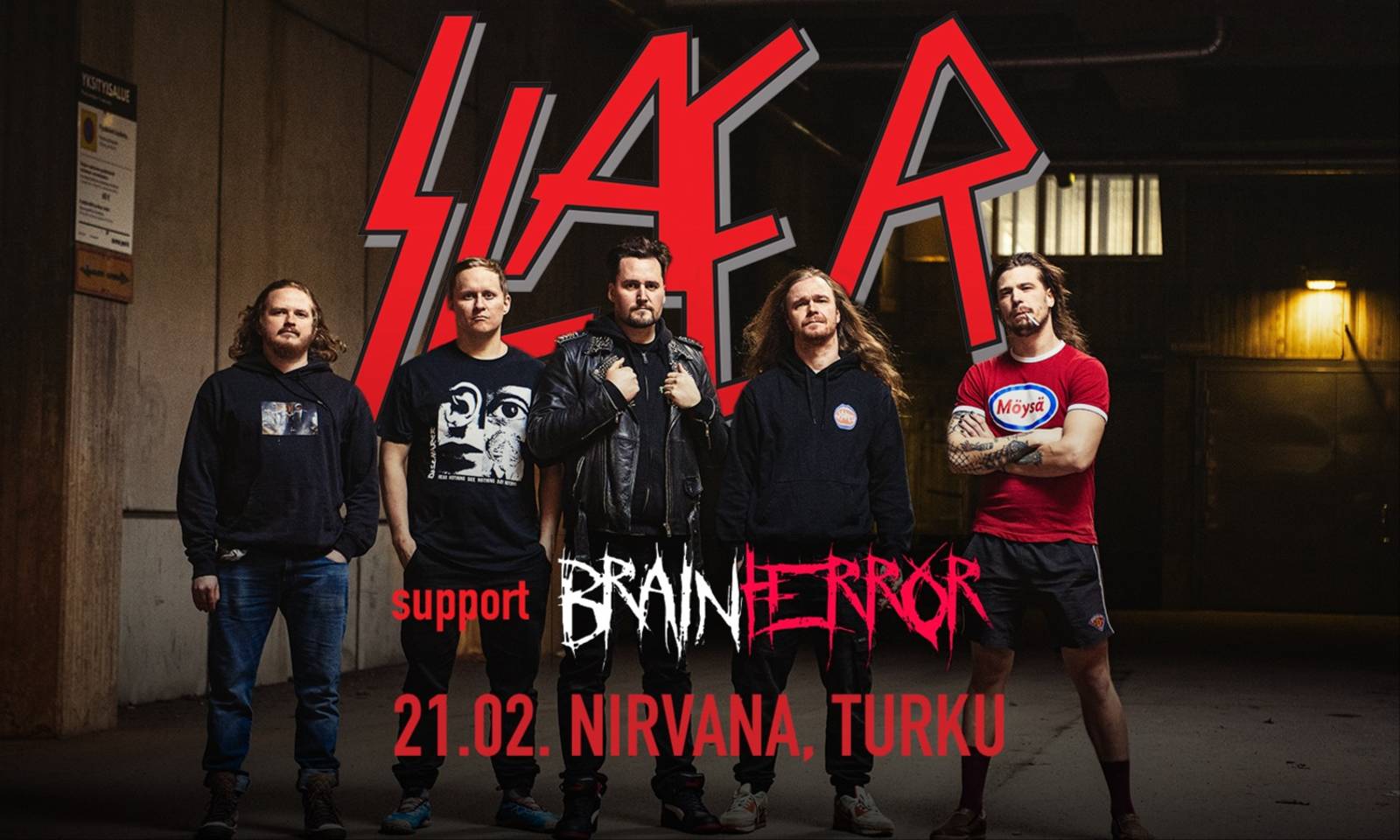 SLÆR plays SLAYER on sitä mitä nimi lupaa: tehdään kunniaa yhdelle thrash metallin pioneereista ja suurista vaikuttajista yli tunnin kellottavalla settilistalla. Ei mitään turhia krumeluureja, vaan bändi, yleisö ja ikoniset biisit. Kokoonpanosta löytyy niin sanotusti alan miehiä: Jesse Kämäräinen (Anzillu, ex-Inkvisitor): Kitara Sami Katajainen (Anzillu, GAF): Kitara Tino Jäntti: (Vanguardian, Kosto, ex-Inkvisitor): Rummut Markus Martinmäki (Vanguardian, ex-Inkvisitor): Vokaalit Pekka Löhönen (ex-Inkvisitor): Bass https://youtu.be/SAKy5-pP93M?si=BRb8rjfPeg6YkmL1 https://youtu.be/AgBXYAzccFQ?si=XGInZ_zF0jBItPnJ Illan avaa Brainterror, joka on neljän lupaavan soittajan thrash metal -bändi. Ahkerasti treenaava turkulaisnelikko on kehittynyt kovaa kyytiä, ja säännöllisesti keikkailevan bändin tiukka yhteissoitto on jo ehtinyt vakuuttaa kaikenikäistä yleisöä. Ensimmäinen julkaisu on tulossa keväällä 2026. https://www.youtube.com/watch?v=-IJnylUwfAg