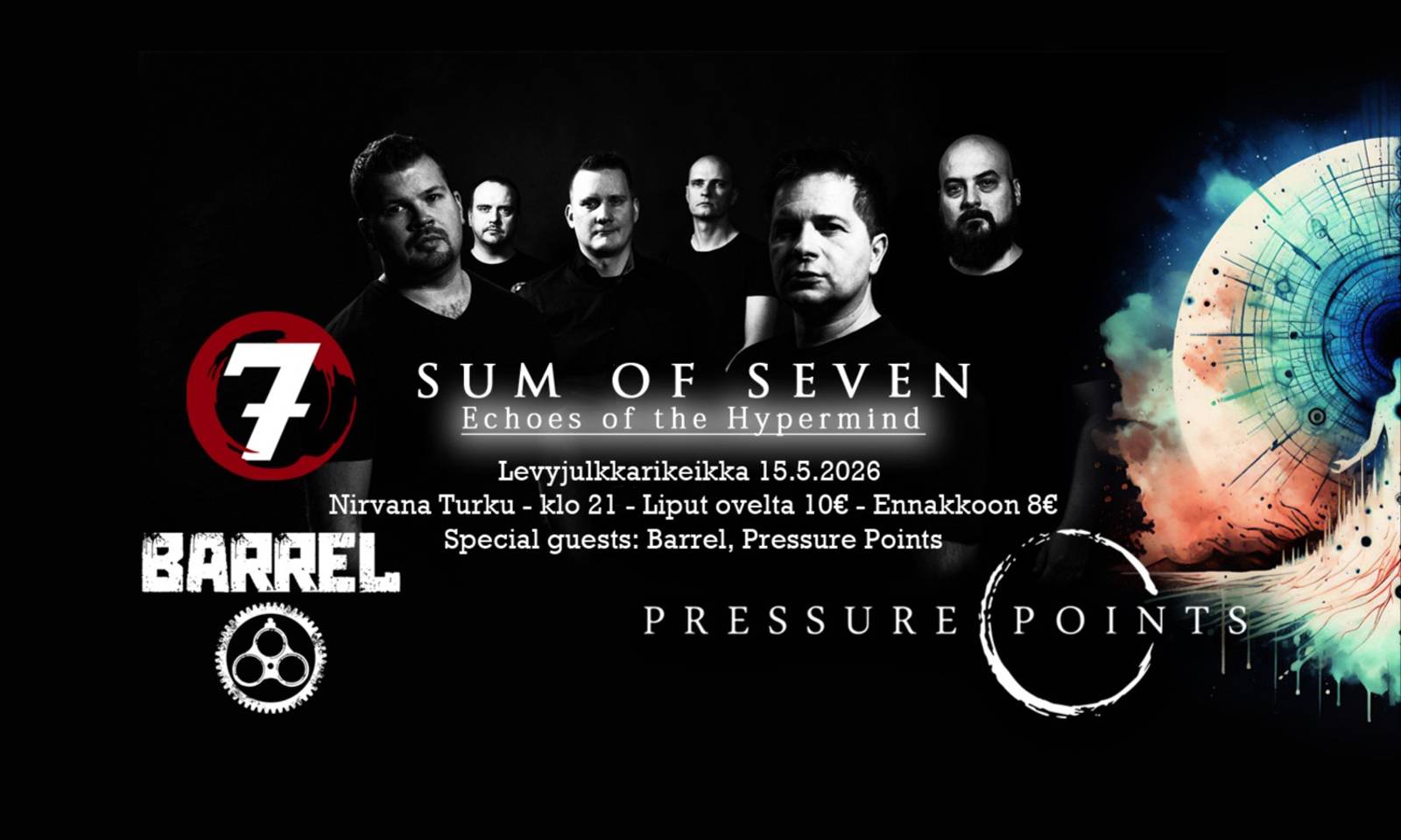Pe 15.5. Fuusio / Nirvana 21.00 ovet 21.30 Pressure Points 22.30 Barrel 23.30 Sum of Seven Liput ennakkoon 8€, ovelta 10€. Narikka 3,50€. Fuusion jäsenkortilla ilmainen narikka. Liity jäseneksi täällä: https://cluby.com/fuusio/memberships/jasenkortti/buy/VENUE_STATU… Sum of Seven: Sum of Seven on progressiivista metallia soittava yhtye, jonka musiikki yhdistää raskaat riffit, moniosaiset sävellykset ja vahvan tunnelman. Yhtyeen pitkään työn alla ollut konseptialbumi Echoes of the Hypermind kertoo tekoälystä, joka herää tietoisuuteen ja haastaa ihmiskunnan käsityksen täydellisyydestä, empatiasta ja vapaasta tahdosta. Albumin ensimmäinen single päätyi Prog-lehden järjestämän Tracks of the Week -äänestyksen voittajaksi, ja on kerännyt kehuja Suomessa ja ulkomailla. Tule katsastamaan yhtyeen livekunto ja juhlistamaan uuden albumin julkaisua! "Supreme" musiikkivideo https://www.youtube.com/watch?v=yLCSY9yWlqI Barrel: Tamperelainen, jämäkkää metallia taidolla takova, Barrel operoi rähjäävästä rokkenrollista rässäämisen kautta aavikoiden ja avaruuden loputtomuudessa leijailevaan raastavan kauniiseen melankoliaan - miksi ajaa itsensä genren kapeikkoon, kun metalli on rajattoman luovuuden kaoottinen voima? Bändi keikkailee parhaillaan promoten samalla "Triptych"-debyyttialbumiaan. "Scavenger" -musiikkivideo: https://youtu.be/FLl_hg-jC6Q?si=6fbqoHa2OQBcI9JS "Triptych" landing page: https://tr.ee/6GNsdrGk4L Pressure Points: Melodista ja progressiivisvivahteista metallia soittava Pressure Points on tehnyt paluun melodisen metallin kentälle ja solminut levytyssopimuksen espanjalaisen Art Gates Recordsin kanssa. Maaliskuussa 2023 julkaistiin "The Island" -albumi, joka keräsi mainiota arvioita niin kotimaisilta kuin ulkomaisilta medioilta. Loppuvuodesta 2024 yhtye julkaisi uutta musiikkia. Syyskuussa 2024 The Chase -single näki päivänvalon musiikkivideon kera. Toinen single, Shapeless, julkaistiin joulukuun 18. lyriikkavideon saattelemana. Samaan aikaan yhtye kirjoittaa uutta materiaalia neljännelle albumilleen ja jatkaa keikkailua. "The Chase" -musiikkivideo: https://www.youtube.com/watch?v=YhKh_zNrSPw "The Island" landing page: https://ffm.to/pressurepoints
