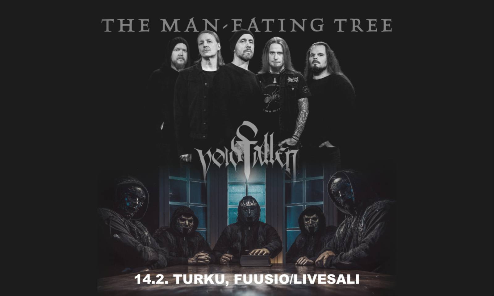 La 14.2. Fuusio / Livesali, Turku THE MAN-EATING TREE VOIDFALLEN Liput 15€ ennakko / 20€ ovelta. Fuusion jäsenkortilla ilmainen narikka. K18. The Man-Eating Tree on tehnyt paluun ja julkaisi viime vuonna uuden levynsä! TMET on tunnelmallista ja melodista metallia soittava yhtye, joka perustettiin vuonna 2009 Oulussa. Voidfallen on teatraalista melodista death metalia esittävä yhtye pääkaupunkiseudulta. Voidfallen ei tingi tyylistään ja yhtyeen uniikki soundi on vailla vertaansa. Mahtipontisista kitara-ja rumpuvyöryksistä tiputaan herkkiin ja hauraisiin syvyyksiin jokaisen kappaleen kertoessa tarinoita surun harmailta rannoilta norsunluutorneihin ja marttyyrien tuskan täyttämiin kohtaloihin. Yhtyeen tavaramerkkinä toimivien naamioiden takaa löytyy joukko pitkän linjan muusikoita. Jokainen esiintyminen toteutetaan äärimmäisellä huolellisuudella kokonaisvaltaista, esteettistä kokemusta tavoitellen.
