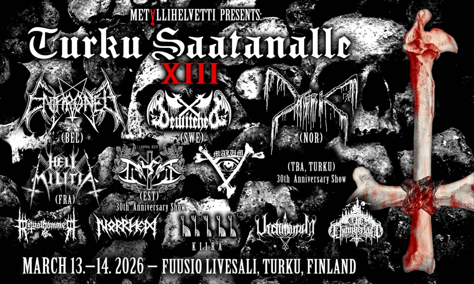 Metallihelvetti presents: TURKU SAATANALLE XIII March 13.-14. 2026 Fuusio / Livesali, Turku, Finland Friday 13.3. "Local Hordes" TBA (30th Anniversary Show, local band from Turku) MALUM NORRHEM KIIRA VICTIMARUM THE CHAMBERLAIN Saturday 14.3. ENTHRONED (Bel) BEWITCHED (Swe) MORK (Nor) HELL MILITIA (Fra) LOITS (Est, 30th Anniversary Show) RITUALHAMMER 2-day tickets 85€ (+0,50€ service fee) Sold also at: https://events.liveto.io/events/turku-saatanalle-xiii Age limit 18 years. Fuusion jäsenkortilla ilmainen narikka!