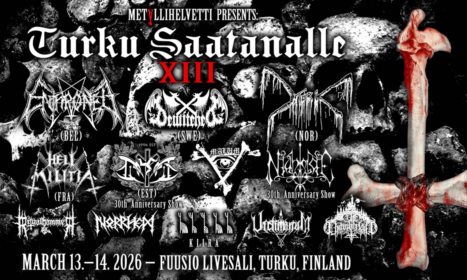 *** THIS IS 2-DAY TICKET *** Metallihelvetti presents: TURKU SAATANALLE XIII March 13.-14. 2026 Fuusio / Livesali, Turku, Finland Friday 13.3. "Local Hordes" NIGHTSIDE (30th Anniversary Show) MALUM NORRHEM KIIRA VICTIMARUM THE CHAMBERLAIN Saturday 14.3. ENTHRONED (Bel) BEWITCHED (Swe) MORK (Nor) HELL MILITIA (Fra) LOITS (Est, 30th Anniversary Show) RITUALHAMMER 2-day tickets 85€ (+2,90€ service fee) Friday ticket 35€ (+1,90€ service fee) Saturday ticket 65€ (+2,90€ service fee) Sold also at: https://events.liveto.io/events/turku-saatanalle-xiii Age limit 18 years. HUOM! Vapaaliput tai alennukset eivät käy tälle keikalle! Fuusion jäsenkortilla ilmainen narikka!