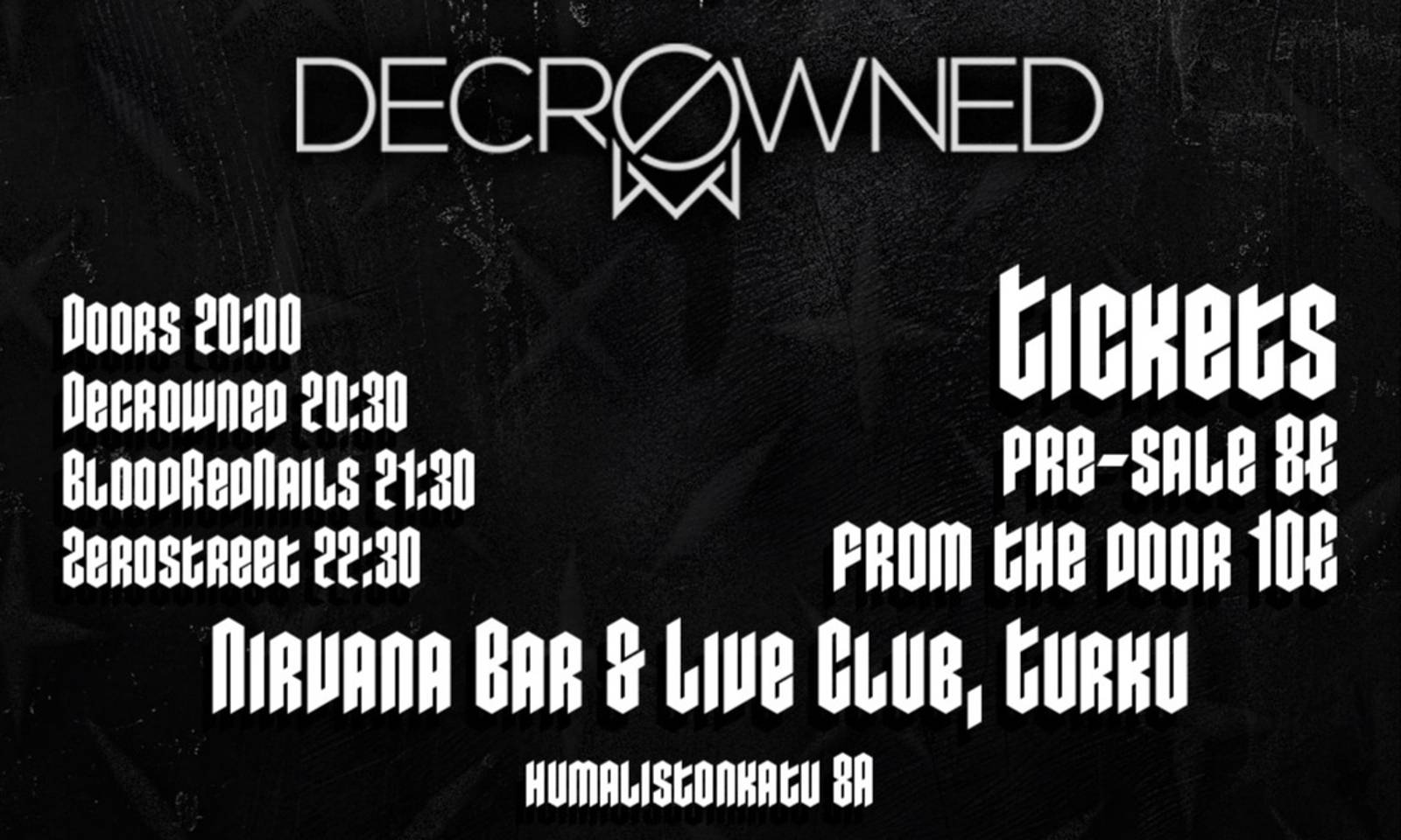 Pe 5.12. Fuusio / Nirvana, Turku ZEROSTREET BLOODREDNAILS DECROWNED Liput 8€ ennakko / 10€ ovelta. Narikka 3,50€ / Fuusion jäsenkortilla ilmainen narikka! Tämä keikka on myös osa Turun Kulttuuritalo Fuusion avajaisviikonloppua! ZEROSTREET Joensuusta maailmalle tinkimättömästi ponnistava Zerostreet yhdistelee taidokkaasti rockin ja metallin parhaat puolet raikkaalla ja omintakeisella groovellaan. Maine laadukkaasta jäljestä on kiirinyt julkaisujen myötä, ja lavalla bändi lunastaa ja ylittää odotukset kerta toisensa jälkeen. BLOODREDNAILS BloodRedNails on tuleva raskaan metallin lupaus. Sooloprojektista tiiviiksi nelihenkiseksi bändiksi kasvanut modernin metallin ja old school death metal- hengen sulatusuuni maustaa biisejään melodisilla ja groovaavilla kertseillä. Varsinais-Suomessa tämä vuonna 2020 perustettu bändi on saanut keikkailla jo mukavasti, mutta suurempien estradien valloittaminen on vasta edessä. BloodRedNailsin ensimmäinen single "Free" on julkaistu yhteistyössä Turku Rock Academyn (TRA) kautta, toinen TRA:n kanssa julkaistu sinkku on Ukrainan sodan uhreille omistettu hyväntekeväisyyskappale "Slava Ukrajini". Kolmas sinkku “Proving Grounds” julkaistiin myös TRA:n kautta, musiikkivideon kera. DECROWNED Hyvät asiat tulevat itä-suomesta ja sitä tarjoaa isoja festarilavojakin tömistellyt Decrowned. Joensuulaiseen hevisoppakattilaan on kaadettu raskaita riffejä, sinfonisia vivahteita sekä ihanan tummaa runttausta. Lopputulos lyö kovaa ja herkullisesti kuulostaen siltä, että Euroopan äärilaidalla keitetään maailmanluokan heviä. On jokaisen oma asia, nauttiiko tämän metalli-illassa ulkoisen tai sisäisen villapaidan kanssa, mutta kylmät väreet kutittavat joka tapauksessa.