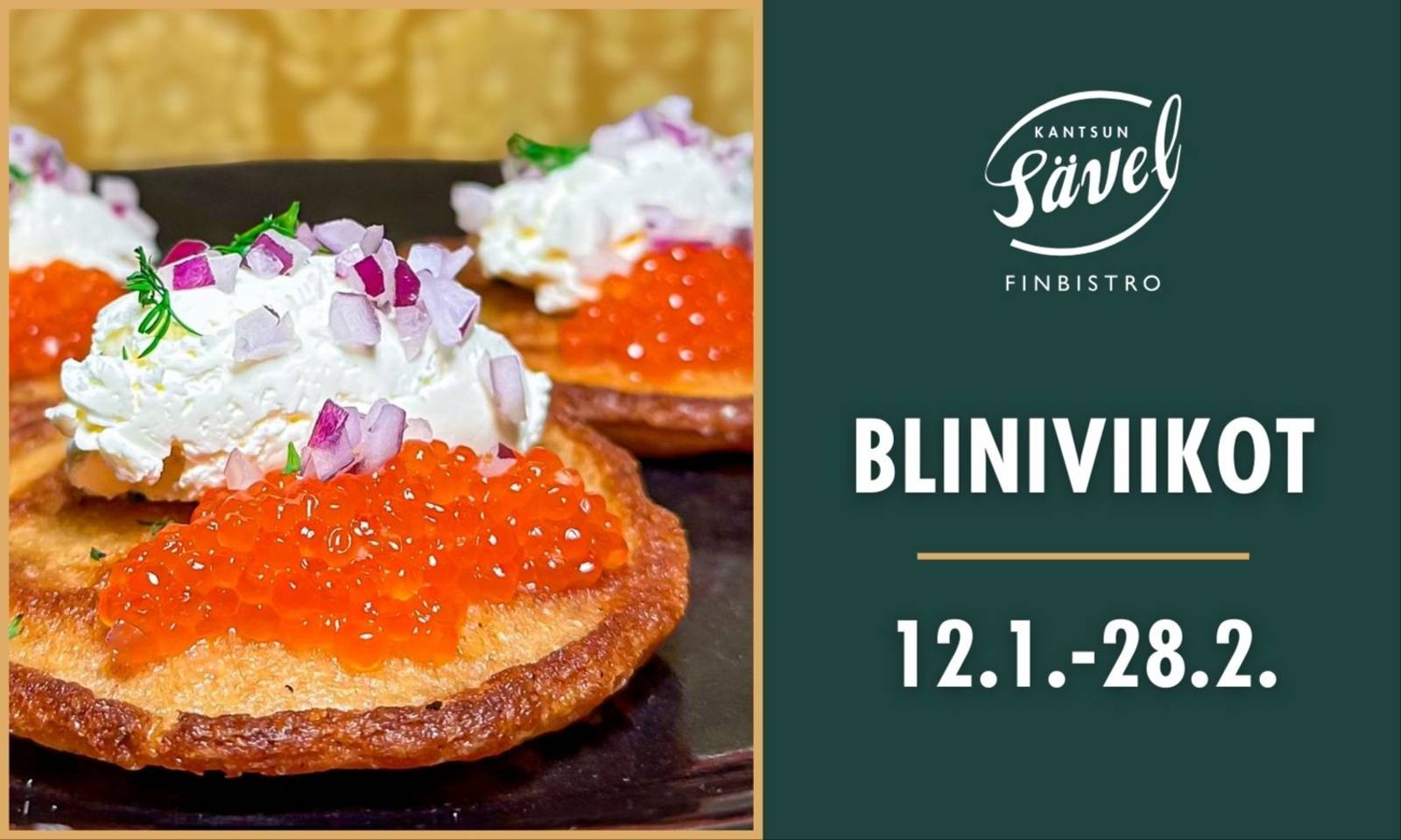 Tervetuloa Kantsun Sävelen Bliniviikoille! Nauti talon herkullisista blineistä, jotka tarjoavat täydellisen yhdistelmän perinteistä ja modernia. Klassiset suolaiset blinit ilahduttavat sesongin parhailla täytteillä, kun taas makeat blinit mahdollistavat uuden tavan herkutella blinejä! Bliniviikot ovat käynnissä 12.1.–28.2.2026 – tule herkuttelemaan blineillä Kantsun Säveleen.