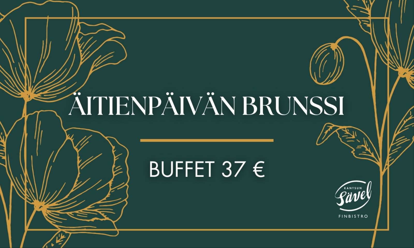SUOSITTU ÄITIENPÄIVÄN BRUNSSI 🌹Tervetuloa nauttimaan herkullisesta Äitienpäivän brunssista Kantsun Säveleen. 🌹 Äitienpäivän brunssi su 10.5.2026 🌹 Buffet aikuiset 37 € / Lapset 2 € / ikävuosi 🌹 Kattaukset 11.00–13.00, 13.15–15.15, 15.30–17.30 ⭐️ Alkuruokabuffet ⭐️ Vihersalaattia kirsikkatomaatilla ja kurkulla (V,G) Mansikka – halloumijuustosalaattia (VL,G) Hedelmälajitelma (V,G) Caesarsalaattia, parmesaanijuustoa ja krutonkeja Balsamico marinoidut herkkusienet (V,G) Kreikkalainen fetasalaatti lohella (L,G) Mätimoussea ja saaristolaisleipää (L) Kirkasta coleslawta (M,G) Parsapiirakkaa (L) Leipävalikoima ja levitteitä (L) ⭐️ Pääruoat ⭐️ Kesäkurpitsakeittoa (L,G) Lämpimät kasvikset (V,G) Parsa-perunapaistosta (L,G) Yön yli haudutettua härkää timjami-punaviinikastikkeella (M,G Uunilohta smetana-yrttikuorrutteella (L,G) Parsarisottoa (L,G tilattavissa keittiöstä) ⭐️ Jälkiruoat ⭐️ Raparperimoussea (L,G) Mango-passionjuustokakkua (L) Tuulihattuja Keksejä ja makeisia Kahvia ja teetä 🌹 Tuo äiti hemmoteltavaksi – varaa pöytä kantsunsavel.fi