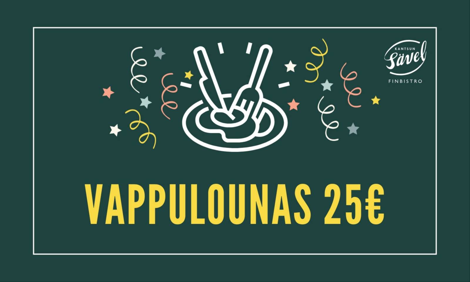 Tervetuloa nauttimaan herkullisesta Vappulounaasta Kantsun Säveleen 🎈 Vappulounas 1.5. klo 12–17 🎈 Buffet 25 € / hlö 🎈 Lapset 1-10 v. 2 € / ikävuosi ALKURUOKABUFFET Vihersalaattia Caesarsalaattia, parmesanjuustoa ja krutonkeja Halloumijuusto-melonisalaattia (VL,G) Mummon kurkkua (V,G) Lajitelma hedelmiä (V,G) Kana-pastasalaatti (M) Perunasalaattia (M,G) Katkarapuskagenia ja saaristolaisleipää (L) Karjalanpiirakat ja munavoi (L) PÄÄRUOKA Pintasavustettua lohta ja hollandaisekastiketta (VL,G) Lihapullia, nakkeja ja dijonmajoneesi (L) Keitettyjä tilliperunoita (L,G) Lämpimät kasvikset (V,G) JÄLKIRUOKA Munkkeja Mariannemoussea (L,G) Makeisia Kahvia ja teetä Simaa Varaa pöytäsi nyt.