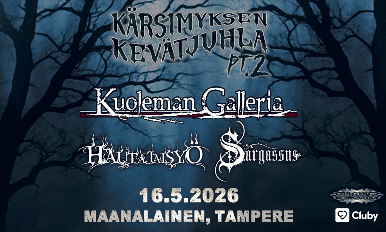 Raging Cannon presents: Kärsimyksen kevätjuhla pt.2 Kuoleman Gallerian debyyttilevyn Kärsimys Kunniaan julkaisusta tulee 2026 kuluneeksi 10 vuotta. Yhtye juhlistaa kuljettua taivalta mm. Tampereella Maanalaisessa ensi toukokuussa Hautajaisyön ja Sargassuksen kanssa. KUOLEMAN GALLERIA kertoo ihmisyyden pimeästä puolesta. Se on paikka, jossa toivon viimeisetkin rippeet on repäisty irti ja jäljellä on vain ammottava kuilu. Se, joka tuohon kuiluun uskaltaa hypätä, saattaa löytää sieltä yllättäviäkin sävyjä. Yhtye on julkaissut neljä levyä ja bändin tyyli on muuttunut alkuaikojen raa’asta black’n’rollista lähemmäs dark metallia. Kuoleman Galleria on lämmitellyt lavoja vuosien varrella mm. legendaariselle …And Oceansille, Mustan Kuun Lapsille, Shade Empirelle sekä ruotsalaiselle Wormwoodille. HAUTAJAISYÖ julkaisee viidennen levynsä "Surun Paino" maaliskuussa 2026. Tulevalla levyllä bändi jatkaa omaa surumielistä vaellustaan suomenkielisen death metallin saralla. Vasta 10v synttäreitä juhlineen bändin tiukkaa livekuntoa on mahdollisuus päästä todistamaan, sillä bändi keikkailee uuden levynsä tiimoilta ympäri Suomea. Tarjolla on niskoja raastavaa menoa, äärimmäisen äkäistä poljentoa ja periksiantamatonta asennetta. Tämä Iisalmen ihme on vieraillut Tampereella muutamaan otteeseen ja uuden levyn kiertue tuo bändi taas "Mansesteriin". Varokee savolaeset tulloo ja valtoo muan! SARGASSUS on juuri uutta lehteä omassa historiassaan kääntävä progemetallilupaus Tampereelta, joka yhdistelee musiikissaan black ja postmetal -vaikutteita, luoden uniikin ja tunnelmallisen soundimaailman. Sargassuksen omaleimainen estetiikka on herättänyt yleisössä ihastusta jo vuoden 2023 puolella ilmestyneen ”King of the Sun” EP:n myötä, joka mm. valittiin erään Tuonela Magazinen kirjoittajan toimesta vuoden EP:ksi. Sargassuksen debyyttialbumi “Vitruvian Rays” julkaistiin 13.6.2025 ja luvassa on livenäkin aikaisempaa brutaalimpaa, teknisempää ja tunnelmallisempaa soittoa, jota kannattaa ehdottomasti tulla todistamaan livenä tilaisuuden tullen! https://www.ragingcannon.fi/ KUOLEMAN GALLERIA https://www.kuolemangalleria.net/ https://www.facebook.com/KuolemanGalleria/ https://www.instagram.com/kuolemangalleria/ https://www.youtube.com/@kuolemangalleria https://kuolemangalleria.bandcamp.com/ https://open.spotify.com/artist/1qH06U3f3AMfIpmRuG2fT2?si=LxT4gE… HAUTAJAISYÖ https://www.facebook.com/Hautajaisyo/ https://www.instagram.com/hautajaisyo/ https://youtu.be/erB1JAtVaH4?si=uj0zSScdfw0Qtsi5 https://youtu.be/nvnT0FD5o78?si=fre772zk4iNL4Rtk https://open.spotify.com/artist/5K4hoTwngmUYiJEvhL2pWN?si=QjUnzQ… SARGASSUS https://sargassus.com/ https://www.facebook.com/sargassusband/ https://www.instagram.com/sargassusband/ https://www.youtube.com/@sargassus1414 https://sargassus.bandcamp.com/ https://open.spotify.com/artist/6LMtEP3qEjyOv8G7wbBjEd?si=hfUWI_…