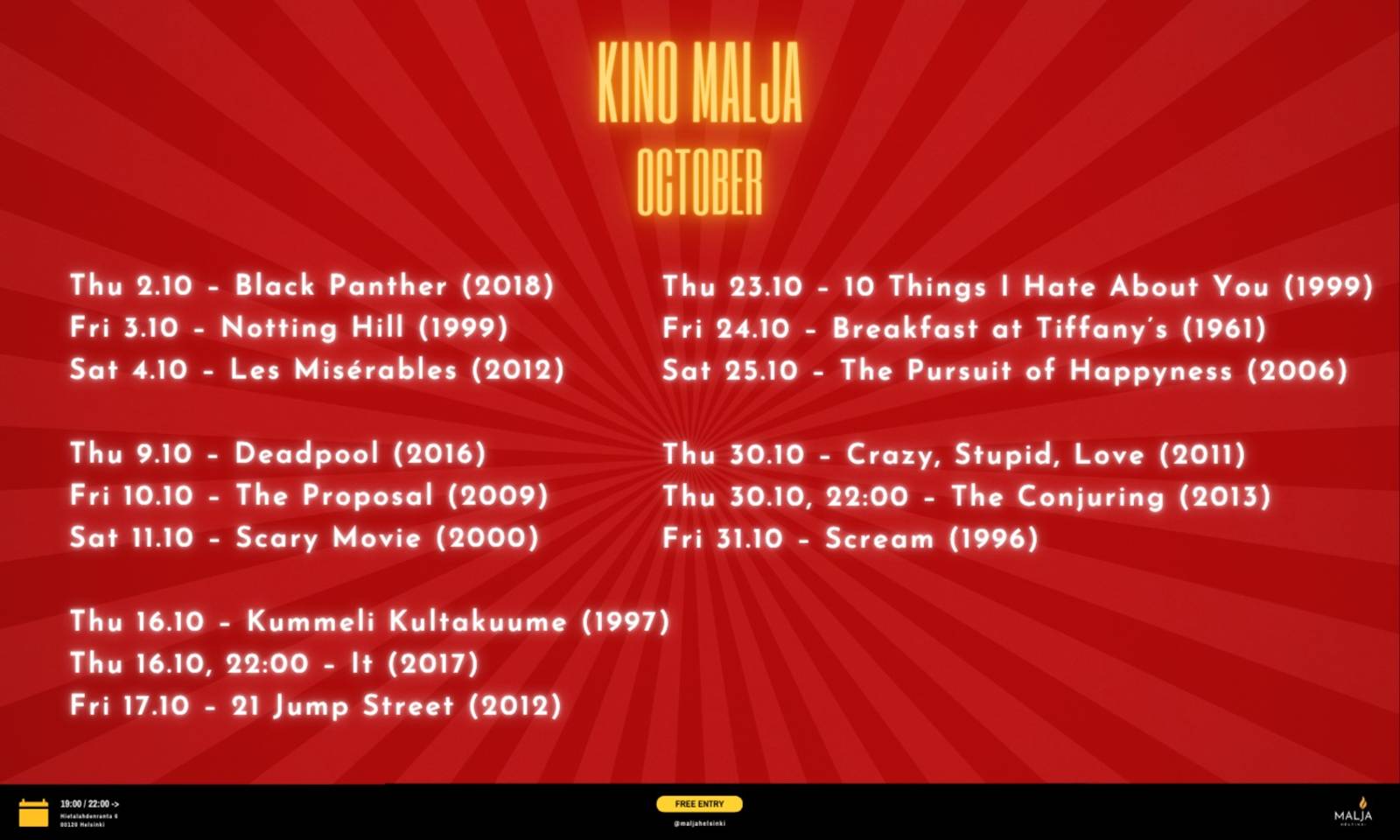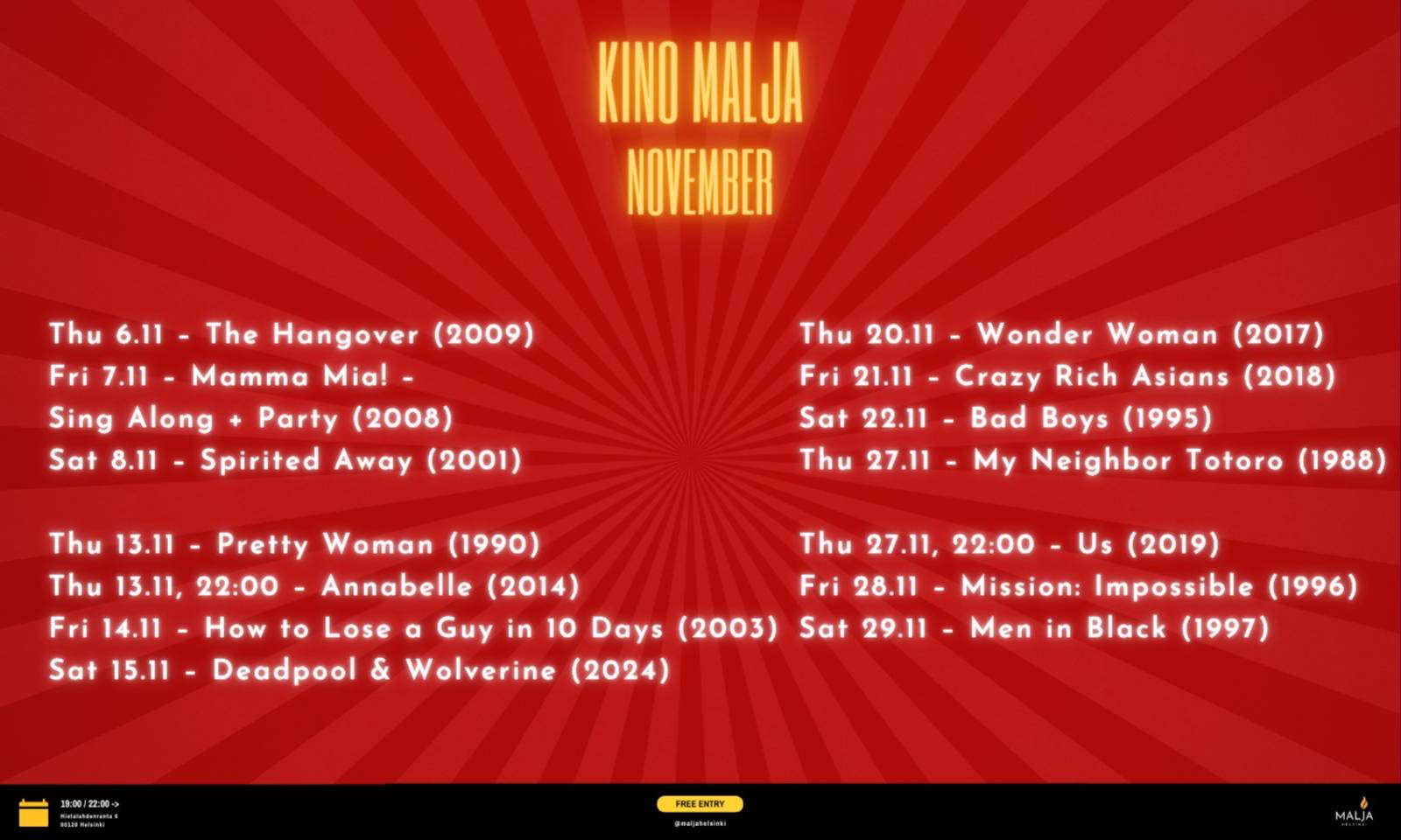 🍿 KINO MALJA 🍿 Finland’s biggest Open Air Cinema has moved indoors! ✨ This winter enjoy over 100 movies on 5 different screens – all completely FREE. 📅 Screenings every Thursday, Friday & Saturday at 19:00 & 22:00 📍 Malja Helsinki – Hietalahdenranta 6 Full program 👉 maljahelsinki.fi