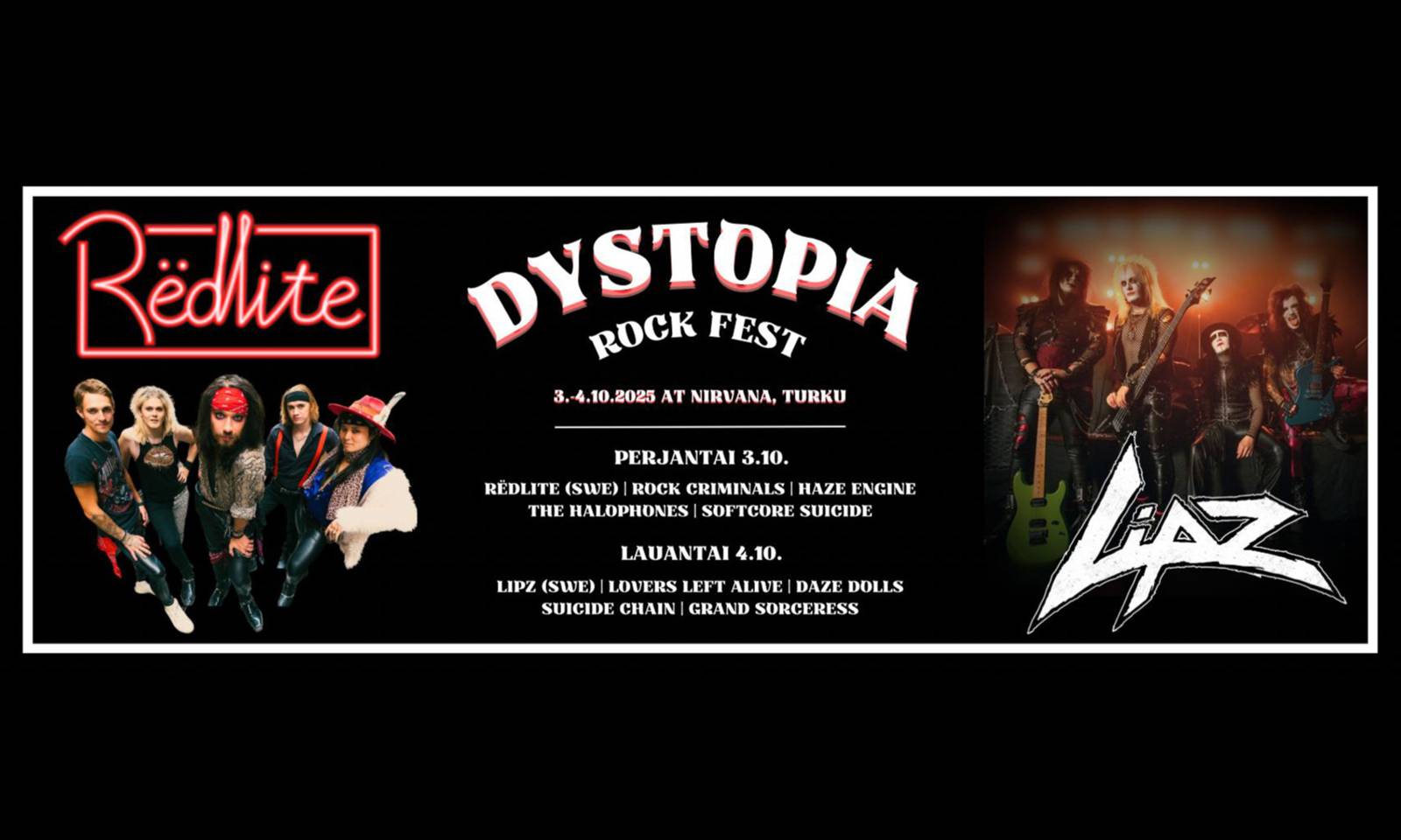 DYSTOPIA ROCK FEST järjestetään lokakuussa Nirvanassa! Vuoden 2025 DYSTOPIA ROCK FEST järjestetään Turun Nirvanassa 3.-4.10. Toista kertaa järjestettävällä minifestarilla soittaa nousevia bändejä sekä Turusta että ulkopaikkakunnilta, jonka lisäksi molempien päivien pääesiintyjät saapuvat Ruotsista ensimmäisille Turun keikoilleen. PE 3.10.2025 20 OVET 20:30 SOFTCORE SUICIDE 21:30 THE HALOPHONES 22:30 HAZE ENGINE 23:30 ROCK-CRIMINALS 00:30 RËDLITE (SWE) LA 4.10.2025 20 OVET 20:30 GRAND SORCERESS 21:30 SUICIDE CHAIN 22:30 DAZE DOLLS 23:30 LOVERS LEFT ALIVE 00:30 LIPZ (SWE)