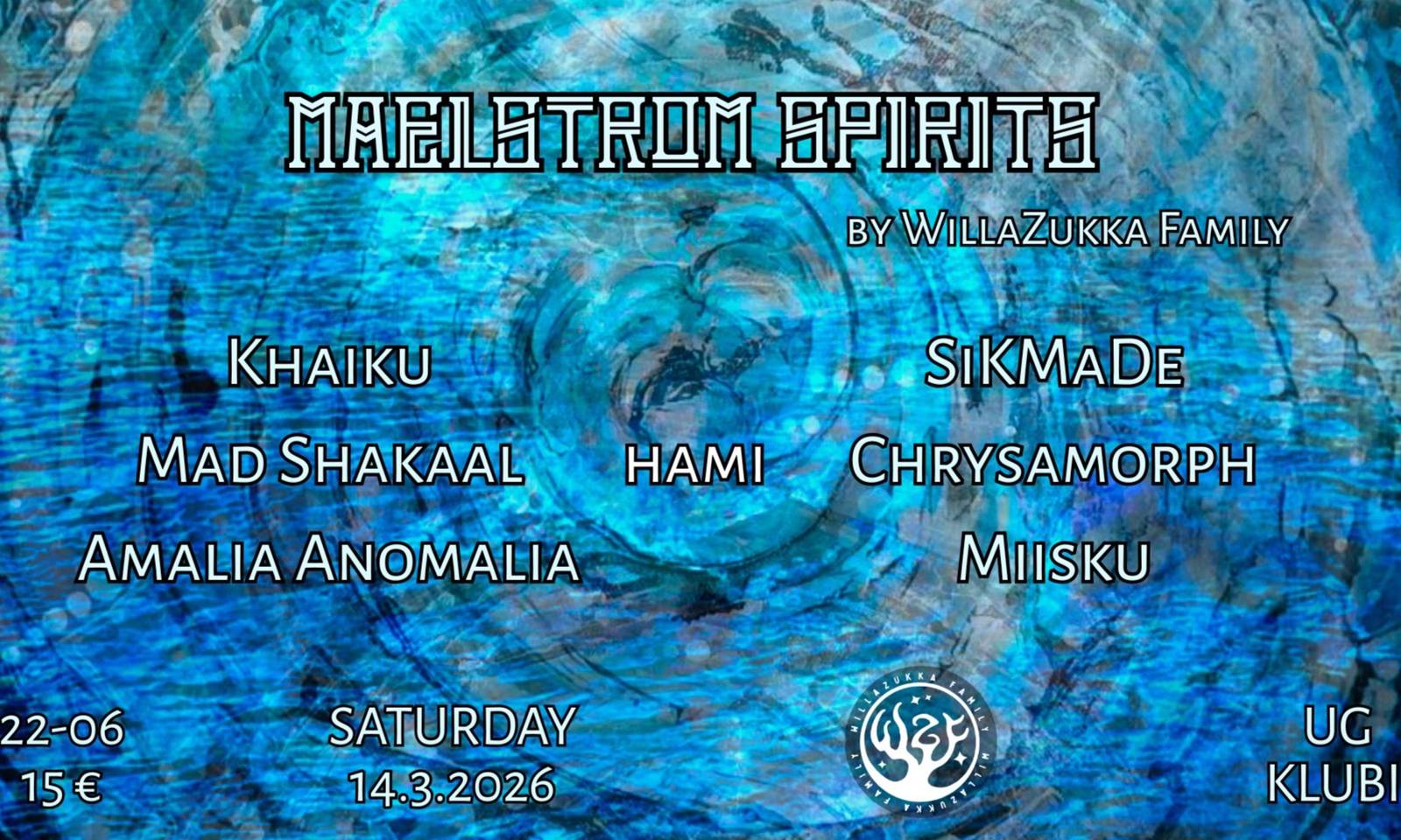 As winter slowly turns towards spring, and the ice and snow begin to melt, this meltwater will flow into larger and larger rivers, ultimately carrying itself out to sea. And from there, the grand waters of the world will continue to crash into each other, circumnavigating the globe, and even forming deadly maelstroms. We welcome you, dear friends, to join the second instalment of our elemental spirit -themed series of parties, this time in honour of the coming springtimes focusing on the fluid, languid, forceful, life-giving yet deadly element of water. Join us in the reinvigorating mist of rainfall, the nimble flow of woodland rapids, and the vengeful beat of ocean waves; welcome to Maelstrom Spirits! As before, we've asked for reinforcements from the CLH clan of spirit-hunters, as we recognise their steady hands at taming the roaring waves. Their soundscapes will be crisp as spring dew, fluid as a garden sprinkler gone mad, and forceful as a water hammer. Surfing alongside these our fabled guest artists will be a shimmering selection of our WillaZukka Family staple DJs, spanning a wide range of genres, styles and attitudes. 🌊 🔊 TIMETABLE: 22:00 Amalia Anomalia (hypnotic techno) https://soundcloud.com/amalia-anomalia 23:00 Chrysamorph (psytech / dark prog) https://soundcloud.com/chrysamorph 00:00 hami (forest) https://soundcloud.com/hami-yugul 01:00 Mad Shakaal (forest) https://soundcloud.com/madshakaal 02:00 Khaiku [CLH] (psytrance) <LIVE> https://soundcloud.com/kaikusounds 03:30 SiKMaDe [CLH] (psytrance) <LIVE/DJ> https://soundcloud.com/toni-saarinen-133571725 05:00 Miisku (nitzhonot) https://soundcloud.com/miiskuu 06:00 END 🫧 DECO: Flowers of Life Willazukka Family