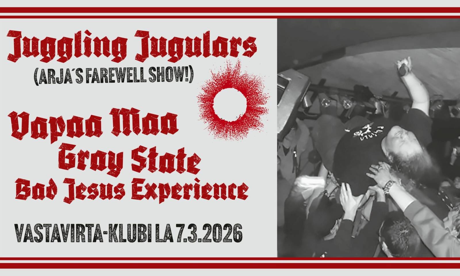 Arja's Farewell Show : Ne olis sit Arjan läksiäisbileet, eli Arjan vika keikka Juggling Jugularsissa. Tuu paikalle! It is Arja´s farewell party as a vocalist of Juggling Jugulars. See you there! Bands: Juggling Jugulars Gray State Vapaa Maa Bad Jesus Experience Juhlissa levyt soittavat: DJ Wennari DJ Jaanamirjami